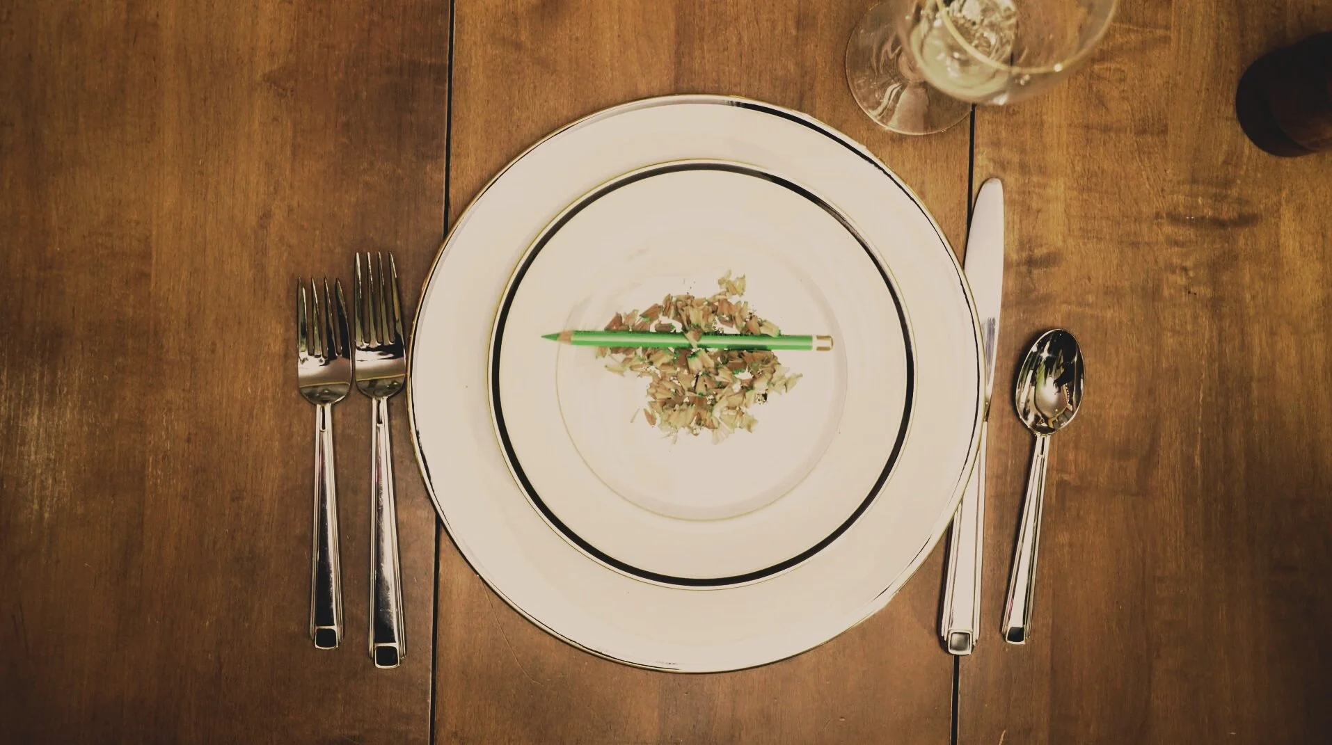 A woman is served an absurd dish and attempts to make it discreetly disappear from her plate.